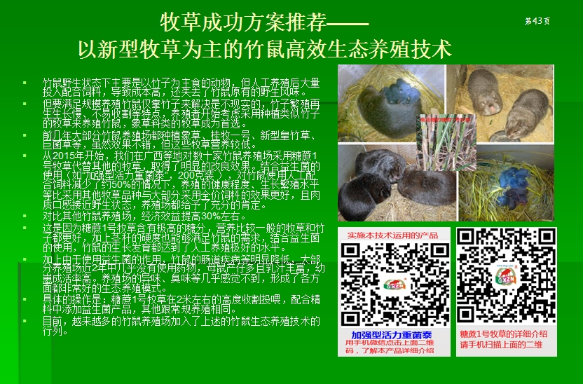 §2015年開始,我們在廣西等地對數(shù)十家竹鼠養(yǎng)殖場采用糖蔗1號牧草代替其他的牧草,取得了明顯的改良效果。結(jié)合益生菌的使用(如加強(qiáng)型活力重菌泰,200克裝 ),對竹鼠使用人工配合飼料減少了約50%的情況下,養(yǎng)殖的健康程度、生長繁殖水平等比采用其他牧草品種與大部分采用全價(jià)飼料的效果更好,且肉質(zhì)口感接近野生狀態(tài),養(yǎng)殖場都給予了充分的肯定。