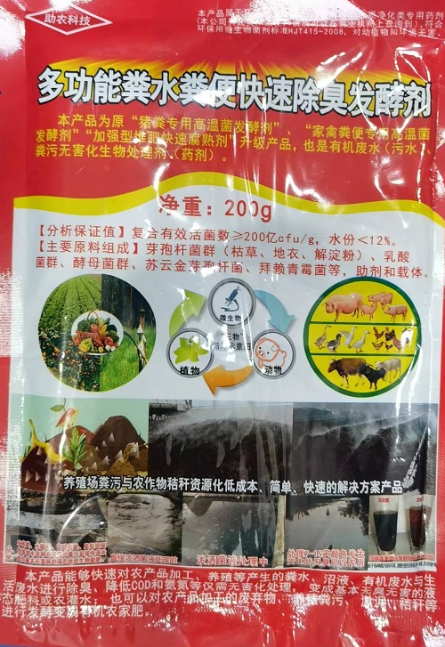多功能糞水糞便快速除臭發(fā)酵劑(200克版)一包直接灑入1-2立方的蠶糞中(也可先與10公斤干糞或木糠等混合,再灑入,這樣更均勻)。留少量菌種兌水后灑在整個料堆的上層。