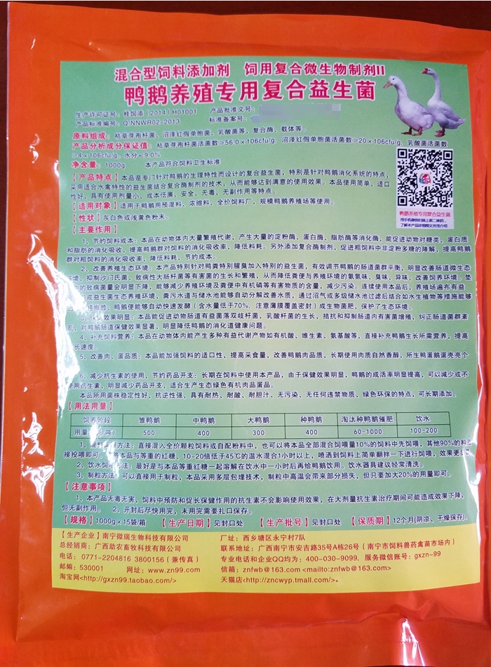 2、改善養(yǎng)殖生態(tài)環(huán)境:本產(chǎn)品特別針對鴨糞特別腥臭加入特別的益生菌,有效調(diào)節(jié)鴨鵝的腸道菌群平衡,明顯改善腸道微生態(tài)環(huán)境,抑制沙門氏菌、致病性大腸桿菌等有害菌的生長和繁殖,從而降低糞便與養(yǎng)殖環(huán)境的氨氮味、臭味、異味,改善飼養(yǎng)環(huán)境。墊料中的致病菌量會明顯下降,能夠減少養(yǎng)殖環(huán)境及糞便中有機磷等有害物質(zhì)的含量,減少污染。連續(xù)使用本品后,養(yǎng)殖場遍布有益菌,形成益生菌生態(tài)養(yǎng)殖環(huán)境,糞污水道與儲水池能夠自動分解改善水質(zhì),通過沼氣或多級儲水池過濾后結(jié)合如水生植物等措施能夠達到合格排放;鴨鵝便能夠自動快速發(fā)酵(含水量低于70%,注意薄膜覆蓋密封)成生物菌肥,保護了生態(tài)環(huán)境。