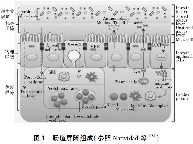 腸道不僅是機(jī)體營養(yǎng)物質(zhì)消化吸收的主要場所,也是機(jī)體抵御外界病原微生物及其有害代謝產(chǎn)物的先天性屏障。腸道屏障從腸腔基底側(cè)依次由微生物屏障、化學(xué)屏障、物理屏障及免疫屏障組成( 見圖1) ,不同的屏障具有不同的生物學(xué)功能和分子調(diào)節(jié)機(jī)制。