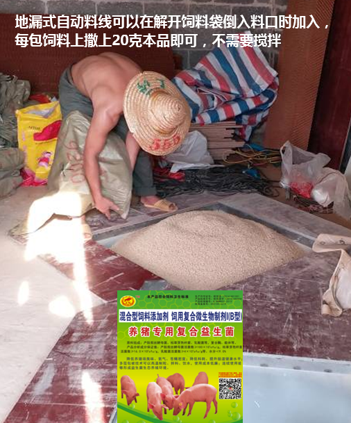 添加方法四:效果第四的是直接將粉劑加入飼料或飲水中,很適合規(guī)模養(yǎng)殖場(chǎng)自動(dòng)供料系統(tǒng),目前是主流模式。以僅僅目前在廣西三千多個(gè)豬場(chǎng)使用的“養(yǎng)豬專用復(fù)合益生菌”為例,目前應(yīng)該是反饋性價(jià)比最高、但效果更好的產(chǎn)品(除臭、除氨氣、降低料耗),也就是之所以是目前用戶群數(shù)量最大的養(yǎng)豬益生菌產(chǎn)品的原因。操作案例(每噸飼料使用500克計(jì)算):①與全部干飼料混合,后直接飼喂,自配干粉料可以保存數(shù)月益生菌不會(huì)變質(zhì);②將500克產(chǎn)品與100-300公斤全價(jià)飼料簡(jiǎn)單混合先飼喂或撒入料桶中,其它700-900公斤飼料不混合常規(guī)飼喂;③自動(dòng)料線可以按照每噸飼料配500克在料車輸入料塔時(shí)加入即可,傳統(tǒng)自動(dòng)料線可以倒入飼料入口將益生菌撒入部分飼料中或者做一個(gè)漏斗讓益生菌慢慢流入即可。如果是采用飲水的方式,只需要將500克益生菌放入2噸清水中(加入500-1000克紅糖更好),至少半小時(shí)后直接給豬飲用,如果是自動(dòng)飲水系統(tǒng),建議取液體部分導(dǎo)入飲水系統(tǒng),下面沉淀物與極少量飼料混合給個(gè)別料槽中即可。