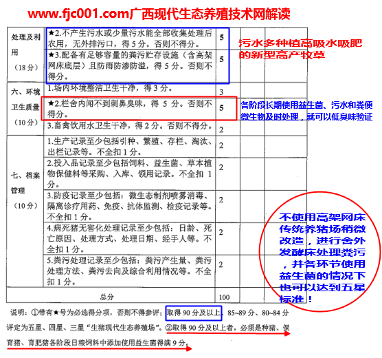 按照廣西畜禽現(xiàn)代生態(tài)養(yǎng)殖的要求,在設(shè)施標(biāo)準(zhǔn)化的情況下,生態(tài)養(yǎng)豬場(chǎng)不一定是高架網(wǎng)床等新型模式,只要達(dá)到以下幾個(gè)要求即可(微生物+模式)。下面的技術(shù)具有只需要簡(jiǎn)單改善、投入成本低、實(shí)用性強(qiáng)等特點(diǎn),可以滿足大部分傳統(tǒng)養(yǎng)豬場(chǎng)進(jìn)行實(shí)施。先要仔細(xì)熟悉廣西生豬現(xiàn)代生態(tài)養(yǎng)殖技術(shù)驗(yàn)收的評(píng)分細(xì)則。
