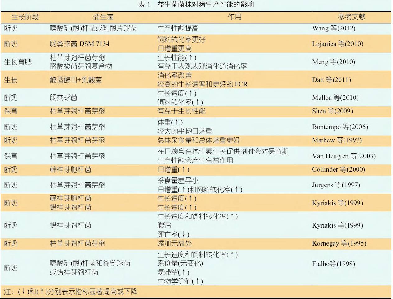 表1 列出的益生菌菌株對豬生產(chǎn)性能的作用。生長是仔豬的一項最主要性狀。從經(jīng)濟角度看,豬的生長性能非常重要,也是影響豬肉生產(chǎn)效益的關(guān)鍵指標(biāo)。通常以增重來表示。據(jù)報道,由于生長速度和飼料轉(zhuǎn)化效率改善,產(chǎn)量增加,間接成本降低,從而提高了經(jīng)濟效益。飼喂益生菌可增加干物質(zhì)攝入量,改善飼料轉(zhuǎn)化效率,從而提高生長速度。不過日糧成分和環(huán)境條件會影響酵母的添加效果。有研究觀察到添加益生菌不會影響采食量,但可顯著改善干物質(zhì)、有機物、粗蛋白、粗纖維和中性洗滌纖維的消化率,但不會影響粗脂肪和酸性洗滌纖維的消化率。日糧中添加益生菌后,豬的生長速度和飼料轉(zhuǎn)化效率顯著改善,單位增重成本下降。斷奶日齡和斷奶重與斷奶后生長密切相關(guān)。多項研究表明,斷奶重會影響斷奶后的生長性能,也會影響其后生長和肥育階段的性能。斷奶仔豬體重每增加1kg,豬達到屠宰體重時至少提前10d,斷奶后第1周平均日增重對隨后生長性能有重要影響。仔豬及其母豬采食活性干酵母添加劑,對采食量幾乎沒有影響,但可顯著改善平均日增重和飼料轉(zhuǎn)化效率。與對照日糧相比,飼喂酵母日糧后,豬具有更好的總采食量和總增重。仔豬日糧添加酵母(每千克日糧2g,飼料酵母含量為2×106CFU/g),斷奶時對照仔豬體重大于處理組仔豬的體重(P<0.05),但斷奶后30d處理組仔豬體重明顯高于對照組仔豬(P<0.01),平均日增重(474g±0.01g)也顯著高于對照(432g±0.01g)。一項研究發(fā)現(xiàn),當(dāng)日糧含有抗菌促生長劑時,添加活性酵母會對保育豬生產(chǎn)性能產(chǎn)生積極的作用,但結(jié)果變異較大;然而,Kornegay等(1995)報道無益處。