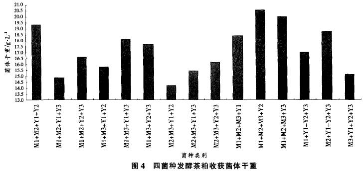 用250mL三角瓶裝茶粕固體發(fā)酵培養(yǎng)基15g,加水20mL。滅菌后接種四菌種的菌懸液(總接種量為15%,4種菌種的接種比為1:1:1:1),在室溫下培養(yǎng)4d。發(fā)酵結(jié)束后以收集到的菌體干重作為測(cè)試指標(biāo),試驗(yàn)結(jié)果見(jiàn)圖4??梢钥闯?,4種菌種組成的混合菌種能更好地利用培養(yǎng)基中的營(yíng)養(yǎng)成分來(lái)維持各菌種細(xì)胞的生長(zhǎng)繁殖,四菌種發(fā)酵可獲得的菌體干重總體上多于雙菌種發(fā)酵及三菌種發(fā)酵。