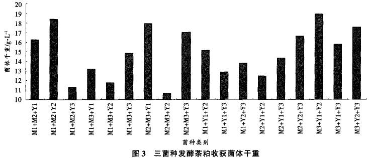 用250mL三角瓶裝茶粕固體發(fā)酵培養(yǎng)基15g,加水20mL,滅菌后接種三菌種的菌懸液(總接種量為15%,3種菌種的接種比為1:1:1)。在室溫下培養(yǎng)4d。發(fā)酵結(jié)束后以收集到的菌體干重作為測(cè)試指標(biāo),試驗(yàn)結(jié)果見(jiàn)圖3??梢钥闯觯捎萌N發(fā)酵茶粕培養(yǎng)基,發(fā)酵后收集到的菌體干重為10.66~18.91g/L,差別較大,其中混合菌種M3+Y1+Y2發(fā)酵茶粕后收集到的菌體干重可達(dá)18.91,菌體干重居首位,粗纖維含量也降低至10.54%。是三菌種發(fā)酵中最優(yōu)的菌種組合。