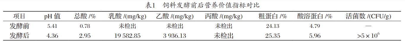 粗蛋白和酸溶蛋白的測定按照中華人民共和國國家標準《GB/T 6432—2018》和《GB/T 22492—2008》。飼料中大豆球蛋白、β-伴大豆球蛋白含量、胰蛋白酶抑制因子的測定均采用酶聯(lián)免疫法,試劑盒由北京龍科方舟生物工程技術有限公司提供?;罹鷶?shù)測定采用梯度稀釋涂布平板方法??偹岬臏y定準確稱取發(fā)酵飼料樣品約0.5g,置于250mL三角瓶中,加入100mL蒸餾水,60℃水浴30min,過濾取40mL上清液,加入2~3滴酚酞指示劑,用標準氫氧化鈉溶液滴定至終點。根據(jù)以下公式計算總酸含量:總酸(%)=[(V2-V1)×C×0.09008]/(M×0.4)×100