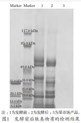 表1可知,發(fā)酵后飼料中活菌數(shù)量大于5×106CFU/g,提示發(fā)酵菌株可以利用飼料中的營養(yǎng)物質進行增殖。飼料原料經(jīng)發(fā)酵后,pH值由5.41下降到4.36,總酸則由0.78上升到2.95,乳酸和乙酸由未檢出分別上升到19582.85和3936.13mg/kg。飼料粗蛋白含量由24.13%上升到25.35%,酸溶蛋白含量由4.79%上升到5.96%。同時,蛋白電泳結果表明,發(fā)酵后飼料中小肽種類明顯增加(見圖1)