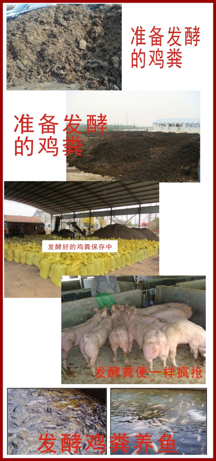 將本品1包, 1000公斤一周內(nèi)的新鮮家禽糞便,淀粉類物質(zhì)如玉米粉100公斤、蛋白類物質(zhì)如菜粕50公斤,攪拌混合蓋膜進(jìn)行發(fā)酵3天左右,有較強酒香醇味、家禽糞便臭味消失時馬上投入池塘喂魚與肥水(過長時間發(fā)酵會影響糞便對魚類所需的營養(yǎng))。比直接家禽糞便入塘可以消除對魚塘的污染,并且具有改良水質(zhì)、對魚健康的優(yōu)點。