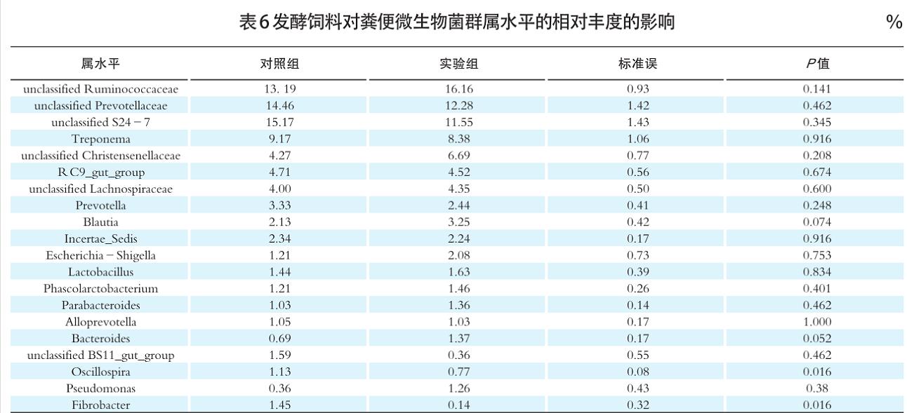在門水平上,糞便樣品共檢測到19個菌門。2組的優(yōu)勢菌門均為 Bacteroidetes、Firmicutes和Spiro-chaetae,占糞便細(xì)菌菌群組成的91%以上。如表5所示,與對照組相比,飼喂發(fā)酵飼料顯著降低了Fi-brobacteres的相對豐度(P<0.05)。在屬水平上,共檢測到262個屬,其中有20個菌屬的相對豐度大于1%。這20個屬的分析結(jié)果在表6展示。與對照組相比,飼喂發(fā)酵飼料顯著降低了Oscillospira和Fibrobacter的相對豐度(P<0.05),有提高Blautia和Bacteroides 相對豐度的趨勢(P<0.1)。