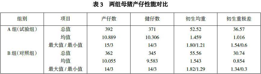 從產(chǎn)仔數(shù)及健仔數(shù)來(lái)看,A 組高于B 組,差異不顯著。從平均初生重與平均初生重極差來(lái)看,B組優(yōu)于A 組且有顯著差異;A 組明顯初生窩均勻度差(–0.162kg),平均初生重輕(–0.084kg/頭)。