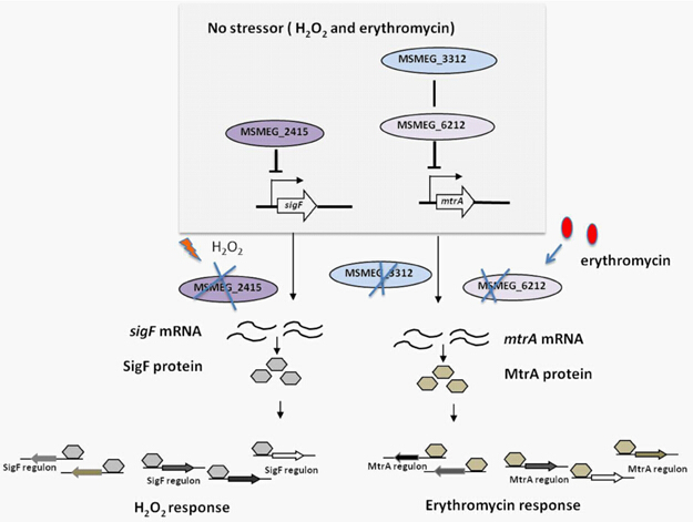 恥垢分枝桿菌是研究結(jié)核分枝桿菌的模式菌株,其有三個(gè)蚯蚓血紅蛋白MSMEG_2415, MSMEG_3312 和MSMEG_6212。米凱霞組研究人員首次通過(guò)基因敲除,回補(bǔ),基因過(guò)表達(dá)技術(shù)以及藥篩,啟動(dòng)子調(diào)控實(shí)驗(yàn),發(fā)現(xiàn)了MSMEG_2415在轉(zhuǎn)錄水平調(diào)控選擇性sigma因子SigF的表達(dá)來(lái)抑制細(xì)菌對(duì)過(guò)氧化氫H2O2的敏感性。相關(guān)研究2015年1月發(fā)表在雜志Frontiers in microbiology(doi: 10.3389/fmicb.2014.00800)。
