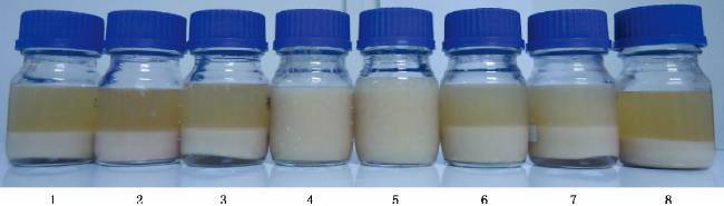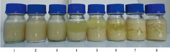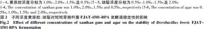 由圖1 可知,將2.0‰穩(wěn)定劑與發(fā)酵液混合,室溫放置3 d 后發(fā)現(xiàn),黃原膠與瓊脂膠懸效果最好,無上下分層,穩(wěn)定性良好。對黃原膠和瓊脂進(jìn)行復(fù)篩發(fā)現(xiàn),1.0‰、1.5‰、2.0‰黃原膠質(zhì)地均勻,無上下分層,穩(wěn)定性良好,其中2‰黃原膠沉淀率最高為26.89%,穩(wěn)定性最好; 0.5‰、1.0‰、1.5‰、2.0‰瓊脂均出現(xiàn)結(jié)塊分層現(xiàn)象( 圖2) 。因此,選用2.0‰黃原膠為穩(wěn)定劑以保證膠懸劑的穩(wěn)定性。