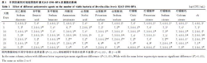 1.2.4 不同防腐劑對短短芽胞桿菌FJAT-1501-BPA保存特性的影響
