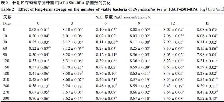 隨著保存時(shí)間的延長,活菌數(shù)略有增加,其結(jié)果見表2。由表2 可知,初始第0 天,鹽濃度為0、3%、6%、9%、12%、15%時(shí)的活菌數(shù)分別為8.08、8.10、8.10、8.08、8.07、8.08 log( CFU/mL) ; 保存300 d后,活菌數(shù)分別為8.76、8.62、8.70、8.67、8.46、8.52 log( CFU/mL) 。同一濃度保存不同時(shí)間,活菌數(shù)顯著升高( P<0.05) ,但總體來說,添加一定量的NaCl 有利于短短芽胞桿菌FJAT-1501-BPA的長期貯存。