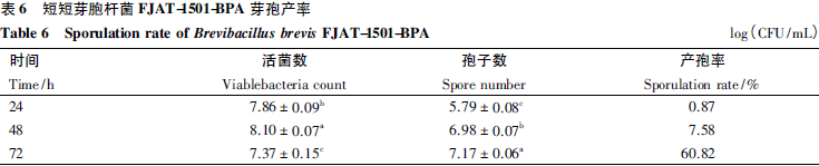 由表6 可知,短短芽胞桿菌FJAT-1501-BPA 在發(fā)酵72 h 時(shí),孢子數(shù)顯著高于發(fā)酵24 及48 h( P<0.05) ,發(fā)酵24、48 及72 h 產(chǎn)孢率分別是0.87%、7.58%、60.82%,說明該菌株具有良好的產(chǎn)芽孢能力。