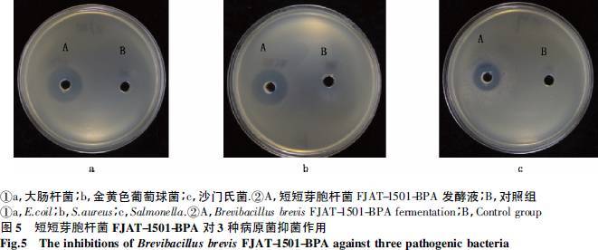 株短短芽胞桿菌FJAT-1501-BPA由本實(shí)驗(yàn)室篩選鑒定; 靶標(biāo)菌株: 金黃色葡萄球菌( Staphylococcus aureus) 、大腸桿菌( Escherichia coli)及沙門氏菌( Salmonella) 均由福建省疾病預(yù)防控制中心提供。