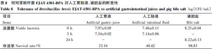 由表8 可知,短短芽胞桿菌FJAT-1501-BPA 在人工胃液中保持3 h 后存活率為23.16%,活菌數(shù)量有一定的降低,說明其對人工胃液中具有一定的耐受性; 在人工腸液中作用3 h 后,其存活率達(dá)到48.62%,說明該菌株對人工腸液具有良好的耐受性; 該菌株在豬膽鹽環(huán)境中耐受性最好,在0.3%( W/V) 的豬膽鹽環(huán)境中培養(yǎng)24 h 后,菌株生長良好,存活率達(dá)到98.83%。