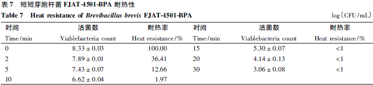 由表7 可知,在100 ℃加熱0、2、5、10、15、20、30 min 后,菌株耐熱率分別為100.00%、36.41%、12.66%、1.97%,加熱15、20、30min 后,菌株耐熱率均<1%,加熱30 min 后活菌數(shù)仍達(dá)到3.06 log( CFU/mL) ,說明該菌株具有一定的耐熱性。