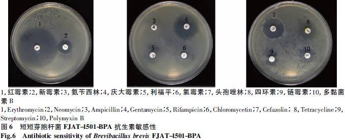 將含有定量抗生素的濾紙片( 頭孢唑林30 μg /片、氨芐西林10 μg /片、慶大霉素10 μg /片、紅霉素15 μg /片、氯霉素30 μg /片、鏈霉素10 μg /片、四環(huán)素30 μg /片、利福平5 μg /片、新霉素30 μg /片、多黏菌素B 30 μg /片)貼在已接種了短短芽胞桿菌FJAT-1501-BPA 的NA培養(yǎng)基上, 30 ℃培養(yǎng)24 h,重復(fù)3 次,觀察生長情況并測量抑菌圈直徑。