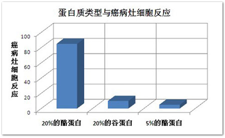 在“大鼠實驗”中,黃曲霉素是一種高致癌物,坎貝爾教授讓實驗老鼠全部接觸同等劑量的黃曲霉素,在體內(nèi)產(chǎn)生腫瘤病灶細胞。然后,他用含不同蛋白質(zhì)的飼料喂養(yǎng)大鼠。 一組大鼠的飼料中含20%的谷蛋白(植物蛋白),一組大鼠的飼料中含20%的酪蛋白(動物蛋白,牛奶中87%的蛋白質(zhì)都是酪蛋白)。還有一組大鼠的飼料只含5%的酪蛋白。