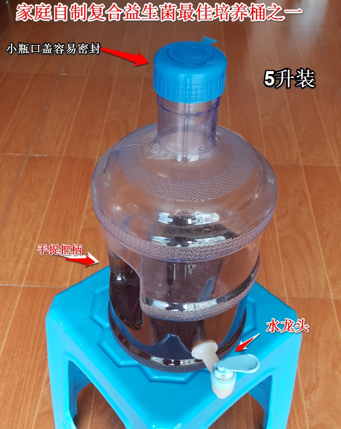 1.容器選擇:必須是食品級(jí)的塑料桶(壺、瓶),容量5升比較好,要確保蓋子能夠完全密封,有水龍頭。因?yàn)橐嫔仨氃趨捬醐h(huán)境下繁育、存儲(chǔ),桶口太大不能保證密封和頻頻開啟桶蓋都會(huì)使雜菌混入,導(dǎo)致變味變質(zhì)。因此在日常過程中,桶蓋一直處于密封狀態(tài),只是使用時(shí)打開水龍頭即可,遇到水龍頭無法出水,只需要松開一下桶蓋,隨即馬上再擰緊確保密封。不可以使用金屬類的容器培養(yǎng)、儲(chǔ)存、運(yùn)輸,因?yàn)橐嫔鸀樗嵝晕镔|(zhì),金屬容器容易造成生銹等;也不建議使用玻璃瓶,一方面由于培養(yǎng)過程中氣體很大,萬一掉在地上會(huì)造成數(shù)倍自然破碎的傷害力,另外玻璃瓶可能不能完全保證密封。