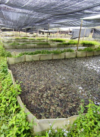 新水入口處長(zhǎng)期滴入激活后的菌種,每1500立方使用一包,也可以每五天潑灑一次,運(yùn)用后能夠確保高密度蛙養(yǎng)殖池水不富營(yíng)養(yǎng)化、不產(chǎn)生惡臭,這樣不僅可以減少換水頻次和用水量,而且可以大幅度降低皮膚疾病和死蛙的發(fā)生。