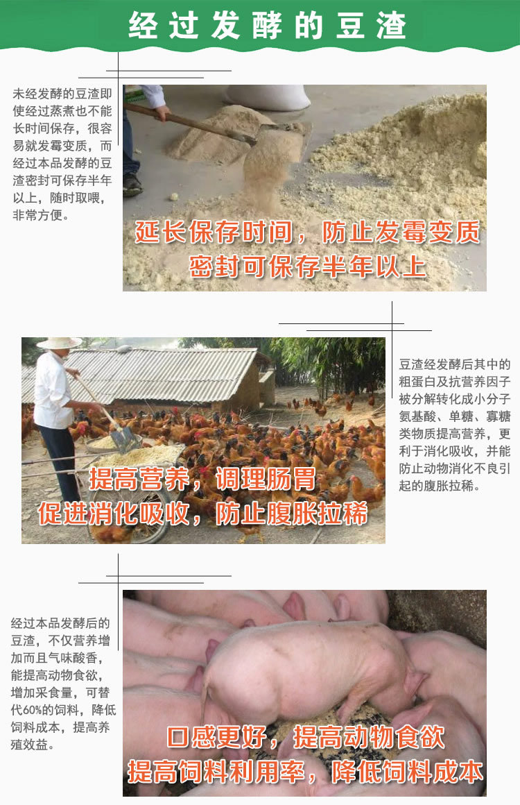 1、發(fā)酵分解飼料,提高飼料利用率:通過(guò)發(fā)酵,可有效消除原料中存在的抗?fàn)I養(yǎng)因子,提高飼料營(yíng)養(yǎng)價(jià)值,有效地將飼料分解、轉(zhuǎn)化為動(dòng)物容易消化吸收的葡萄糖、氨基酸等小分子物質(zhì),從而提高飼料的營(yíng)養(yǎng)價(jià)值和利用轉(zhuǎn)化率,同時(shí)在發(fā)酵過(guò)程中,有效地抑制飼料上附著的有害雜菌和病原微生物,提高飼料品質(zhì)。