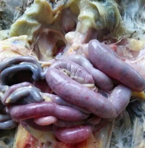 2.小腸擴(kuò)張、肥厚、變粗、嚴(yán)重壞死,腸管中有凝固血塊,使小腸在外觀上呈現(xiàn)淡紅色或黃色。腸壁上可見針頭大小的紅色圓形出血點(diǎn)。