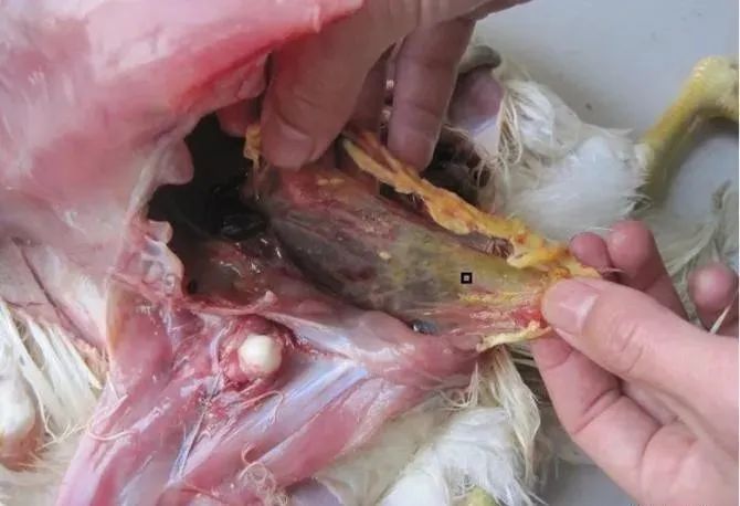 病雞通常呼吸道的癥狀比較明顯。不僅氣喘甩鼻、呼嚕、腫頭腫眼、張口呼吸、流淚,精神萎靡、食欲減退。嚴(yán)重的氣囊炎可見氣囊壁增厚,有大小不等的黃白色到黃色干酪樣滲出物,肺臟充血、出血,喉頭出血,氣管出血嚴(yán)重。另外,有的病死雞還會出現(xiàn)心包炎、肝周炎,腹膜炎等癥狀。
