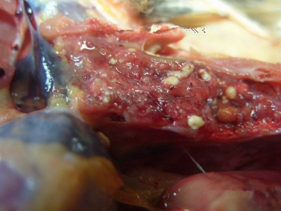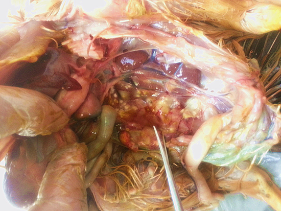 氣囊和肺部的變化較突出。在肺臟、胸復(fù)部氣囊、胸腹腔漿膜、心外膜、肝臟上有米粒大至黃豆粒大的黃白色結(jié)節(jié),呈球型易剝離,質(zhì)地緊硬呈橡皮樣。胸腹部氣囊膜增厚,呈云霧狀混濁。嚴(yán)重者氣囊膜上出現(xiàn)一層白色的滲出物,亦可見整個氣囊增厚、混濁,呈皮革樣。有的病雞可引起肺水腫,整個肺臟成為黃白色干酪樣物質(zhì),切面可見大小不等的圓形黃色結(jié)節(jié)。