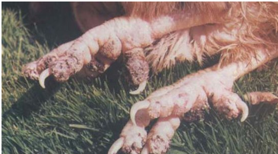 2012年7月14日,某雞場引進(jìn)的2 100只2月齡的雞群突然發(fā)病。病雞表現(xiàn)精神沉郁,縮頭垂翅,食欲減退或廢絕,離群蹲伏,不愿走動(dòng),羽毛松亂;胸、腹、大腿內(nèi)側(cè)局部羽毛脫落,掉毛部位皮膚發(fā)炎、腫脹;皮下疏松組織較多的部位觸之有波動(dòng)感,皮膚破潰后有血樣滲出物,呈暗紫色或紫黑色;部分病雞在翅膀內(nèi)側(cè)、翅尖、尾部、頭臉、背和腿等部位皮膚上出現(xiàn)大小不等的出血點(diǎn)、炎癥及壞死癥狀,局部干燥結(jié)痂;跗關(guān)節(jié)和趾關(guān)節(jié)炎性腫脹,局部呈暗紫色或紫黑色,有的破潰結(jié)痂,個(gè)別有趾瘤,腳底腫脹,站立和行走困難,跛行,多在病后3~5天死亡。