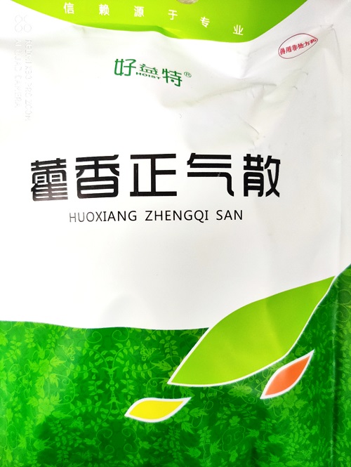 藿香正氣散+冰爽VC, 各500克拌料700斤, 中午餐時(shí)喂1次/d。